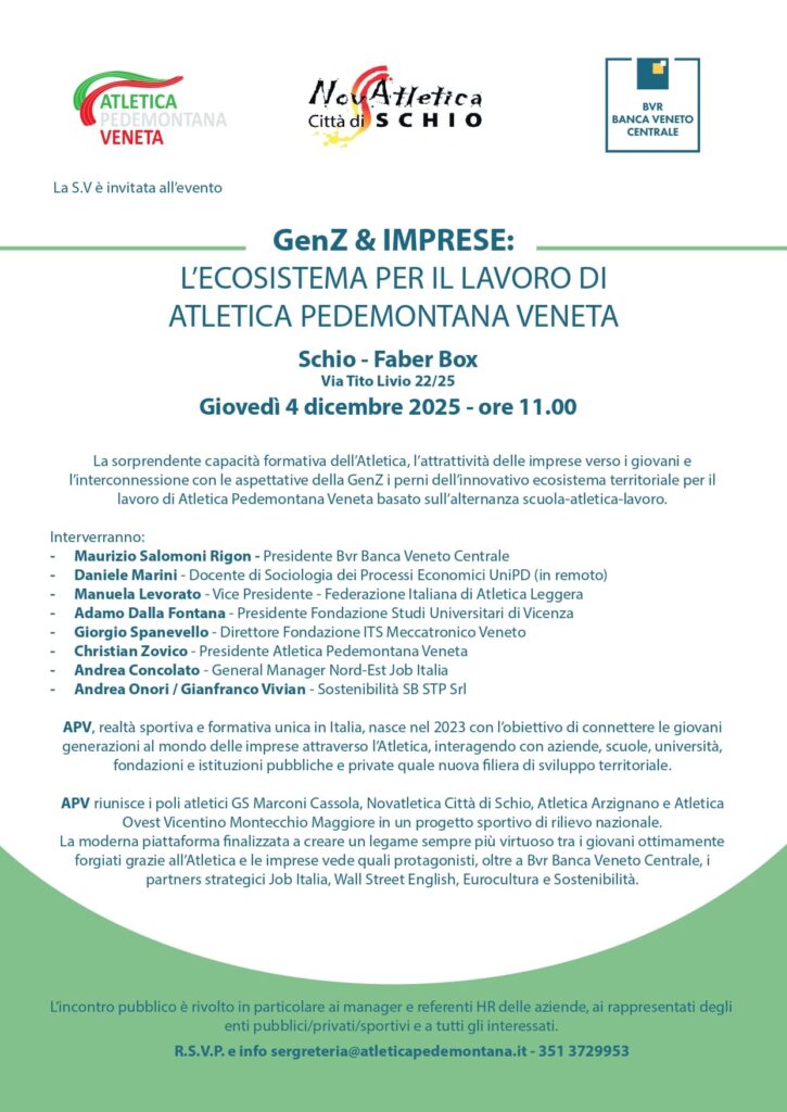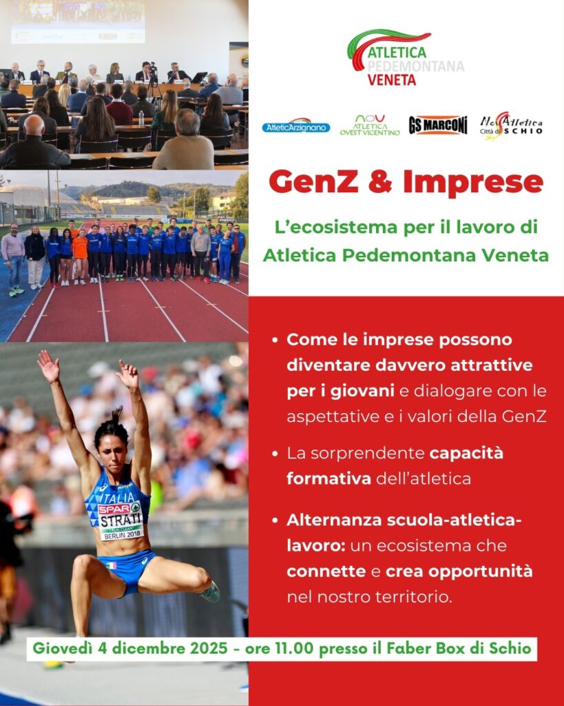 Il 4 dicembre 2025 Atletica Pedemontana Veneta, sodalizio formato dall’alleanza tra GS Marconi Cassola, Atletica Ovest Vicentino, Novatletica Schio, Atletica Arzignano, organizza il convegno “GenZ & Imprese” per capire come funziona l’Ecosistema scuola-atletica-lavoro avviato appunto da Atletica Pedemontana Veneta, mettendo insieme la capacità formativa dell’atletica, l’attrattività delle aziende verso i giovani e l’interconnessione con le aspettative della GenZ.